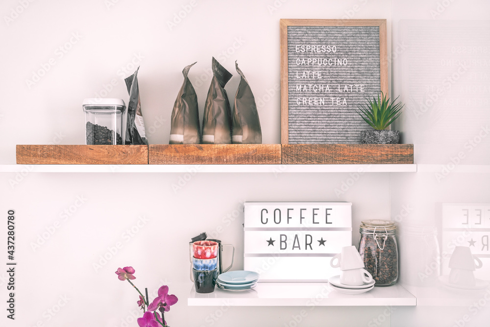Coffee shop menu sign on wall shelves hipster trendy store for espresso shots. Felt letter board lightbox showing text selling cappuccino, latte, matcha tea.