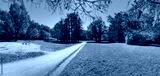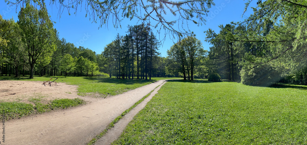 Panorama of first days of summer in a park, long shadows, blue sky, Buds of trees, Trunks of birches, sunny day, green meadow