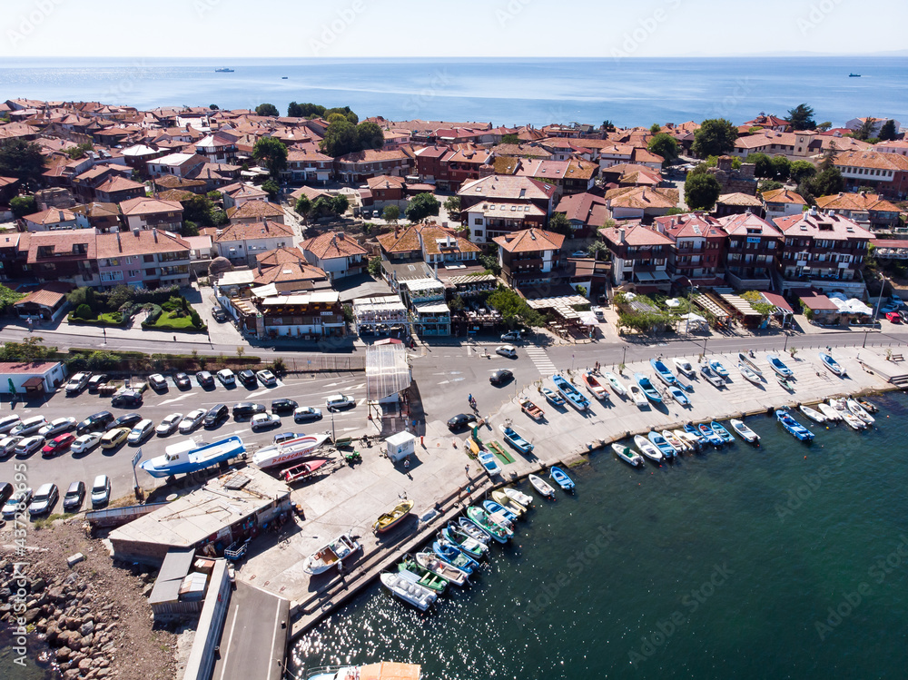Drone aerial view from above of Nessebar ancient city on the Black Sea. Summer holidays destination