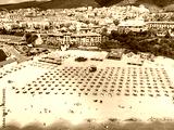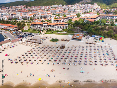 Aerial photography, drone view of sunbeds on the beach in Sveti Vlas. Panoramic view of resort in Sveti Vlas in Bulgaria. Summer holiday in Europe.