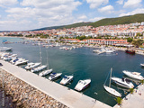 Summer holidays in Europe during quarantine. Panoramic aerial view of ships and yachts the sea port marina of Sveti Vlas in Bulgaria. Aerial photography, drone view.