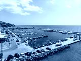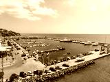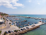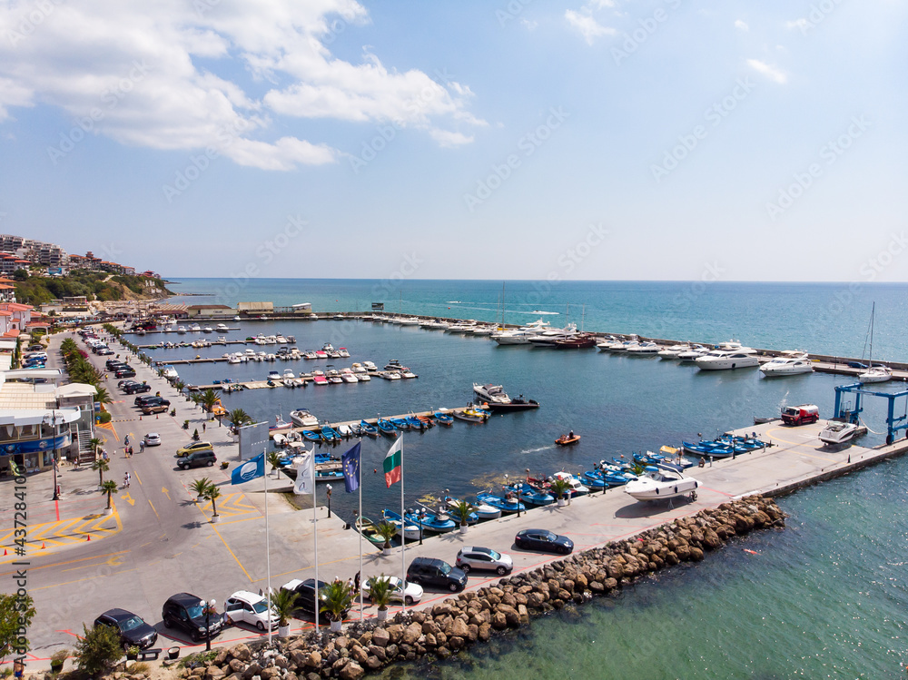 Summer holidays in Europe during quarantine. Panoramic aerial view of the sea port marina of Sveti Vlas in Bulgaria. Aerial photography, drone view.