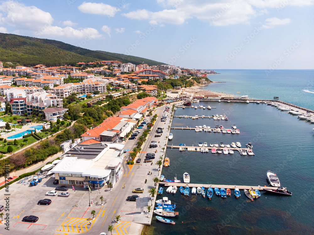 Panoramic aerial view of the sea port of Sveti Vlas in Bulgaria. Summer holiday in Europe. Aerial photography, drone view.