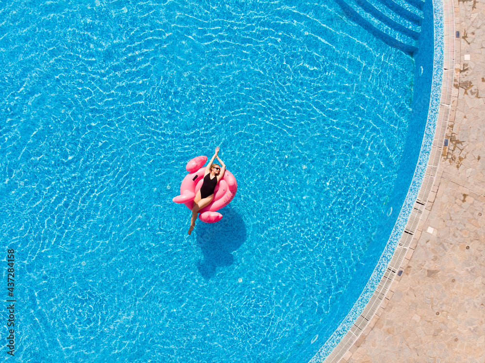 Summer holidays, relaxation. Woman on flamingo pool float in pool, drone aerial view.