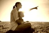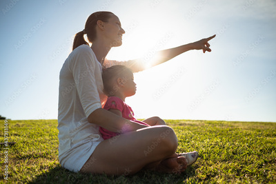 Mother and child sitting outdoors together in the park talking a learning about nature. childhood learning, and development concept.