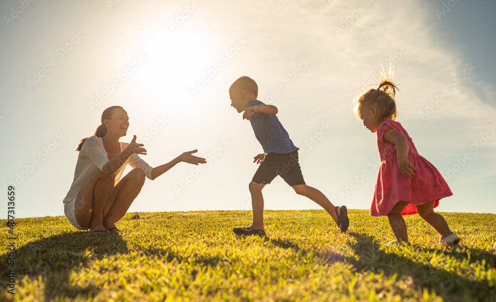 Happy children running to mothers arms. Family lifestyle, and childhood concept.
