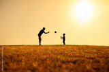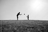 Father and son outdoors playing catch with ball. Fatherhood, family sports and recreation concept.