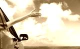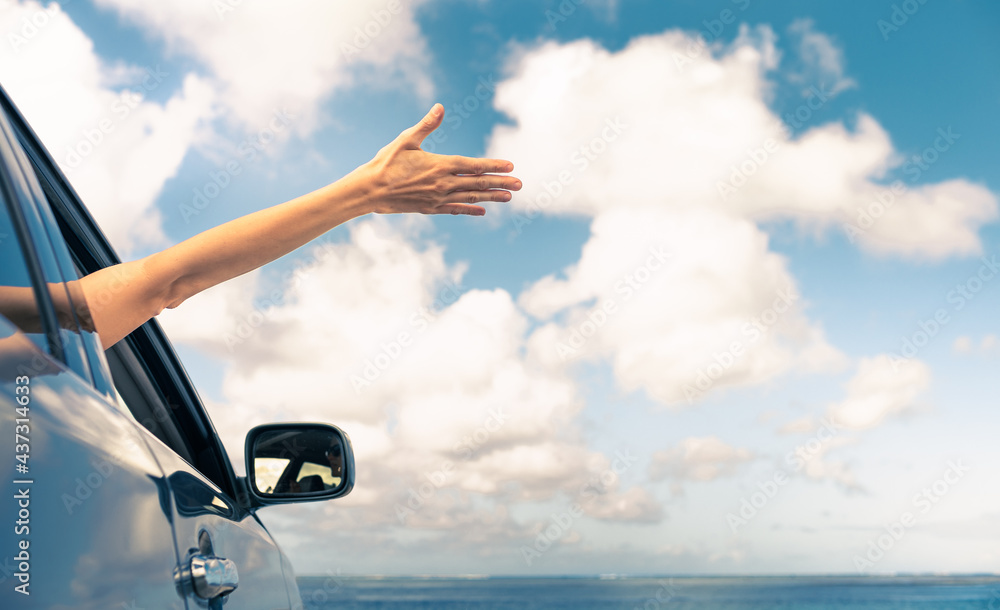 Happy girl sitting in car with hand out of window. Beach fun, summer road trip.
