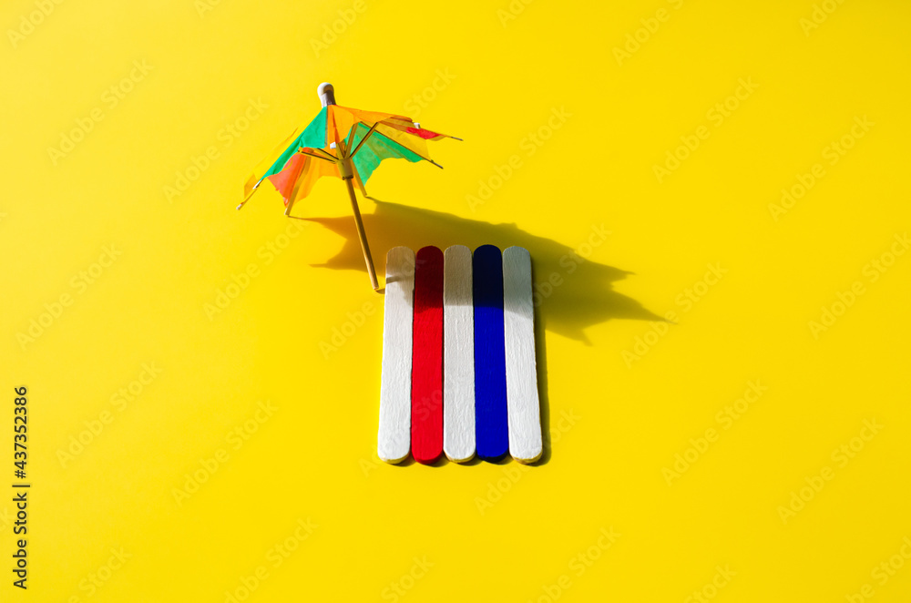 Colorful beach towel with sun umbrella on yellow sand beach. Minimal summer concept.