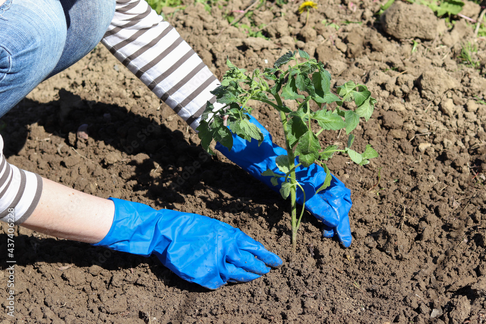 A person in rubber gloves plants a young tomato plant in the ground.