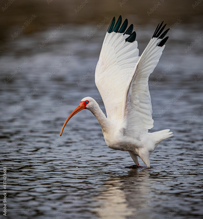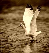 White ibis with wings high takes flight