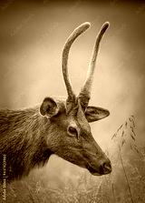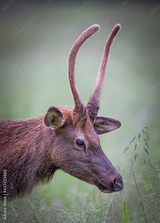 Young male elk with soft antlers grazes in fall