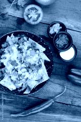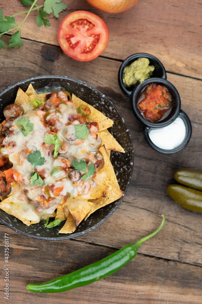 A plate of delicious corn chips nachos in cheddar cheese with beans, tomato, green chili, black olives, cilantro served with guacamole, sour cream and tomato salsa dip on the side isolated on the wood