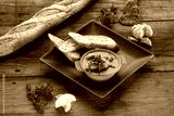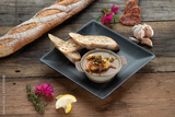 Gambas Pil Pil - Sizzling prawns with chili and garlic served with bread on the side isolated on wooden rustic table