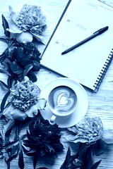 Morning coffee mug for breakfast, empty notebook, pencil and pink peony flowers on white stone table top view in flat lay style.
