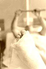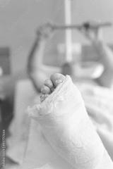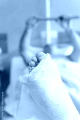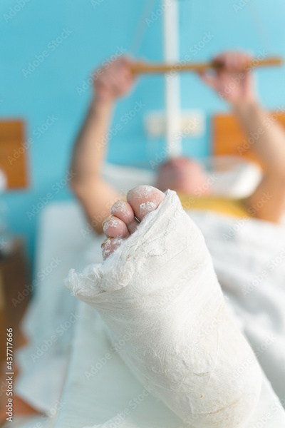 The man broke his leg, is in the hospital, his leg is in a cast. A man is waiting for an operation.