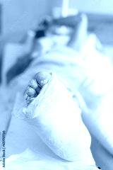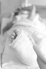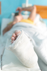 The man broke his leg, is in the hospital, his leg is in a cast. A man is waiting for an operation.