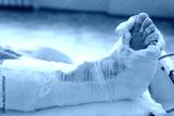 The man broke his leg, is in the hospital, his leg is in a cast. A man is waiting for an operation.
