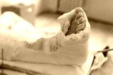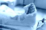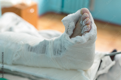 The man broke his leg, is in the hospital, his leg is in a cast. A man is waiting for an operation.