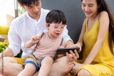 Happy Little young child using smart phone for playing and watching game or cartoon on internet online with family Lovely children stay with parent on weekend holiday Father mother and son enjoy life