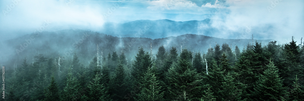 Panoramic View Of Mountain Ridges With Fog And Pine Trees At Dusk