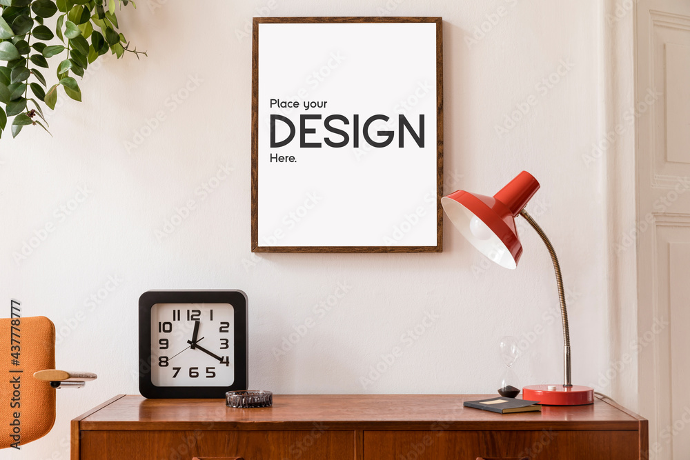 Minimalistic and stylish mock up poster frame concept with retro furnitures, hanging plant, table lamp, decoration and elegant accessories. White walls. Template.