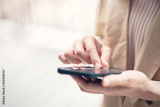 Closeup female using smartphone, she chatting online messaging and social network on mobile.