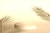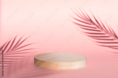 Background for cosmetic products, pink minimal wooden scene with geometric shape. round podium. Empty showcase for packaging product presentation. Mock up pedestal.