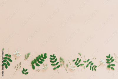 plants ornament on beige color background flat lay, copy space