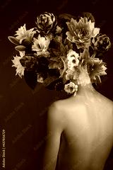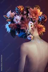 Beauty flowers face of a woman with double exposure. Portrait of a girl neon light and color, professional makeup, nude back of a woman, flowers in the head