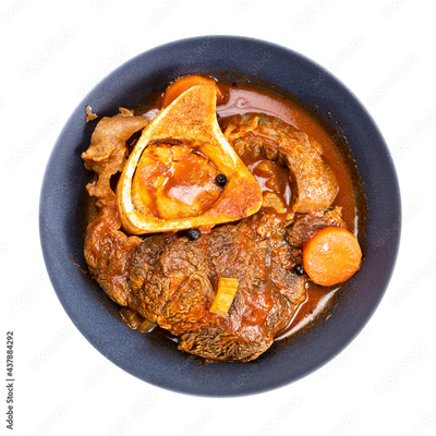 top view of portion of ossobuco in bowl isolated
