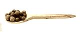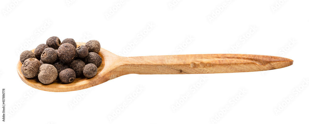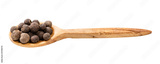 wood spoon with allspice jamaica peppers isolated