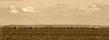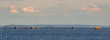 Panorama of Baltic sea shelf with boulders and stones. Clouds, yacht and birds in evening warm light. Clean nordic nature in gulf of Finland.