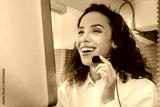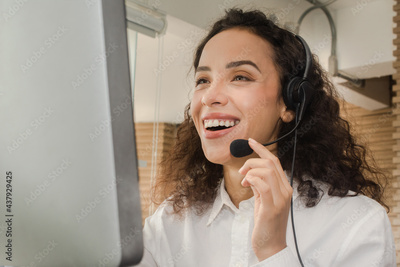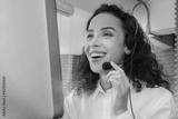 Woman call center work happy, Operator online support customer service technolog