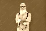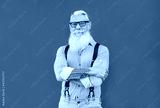 Happy hipster senior man looking in camera and smiling - Trendy elderly person with grey hair and tattoo