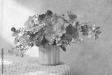 A bouquet of pansies and forget-me-not flowers in a vase on the table. Blur, selective focus.