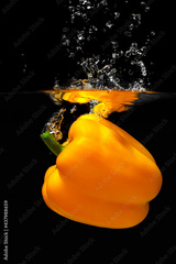 Big yellow bell pepper falls into the water.Fresh yellow paprika splash in water on black background