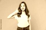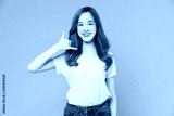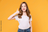 Studio shot of cheerful beautiful Asian woman in blue color dress and wearing a hat with calling hand show and stand on yellow background.