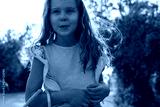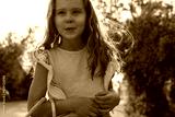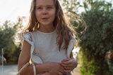 girl with basket walking in countryside on sunlight, blooming trees springtime