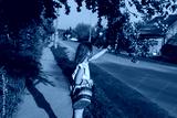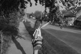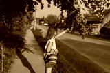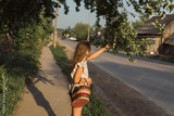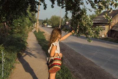 girl with basket walking in countryside on sunlight, blooming trees springtime