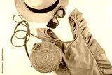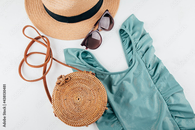 Feminine summer travel fashion concept. Swimsuit, hat, bag, sunglasses on white background, flat lay