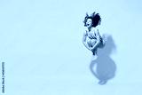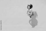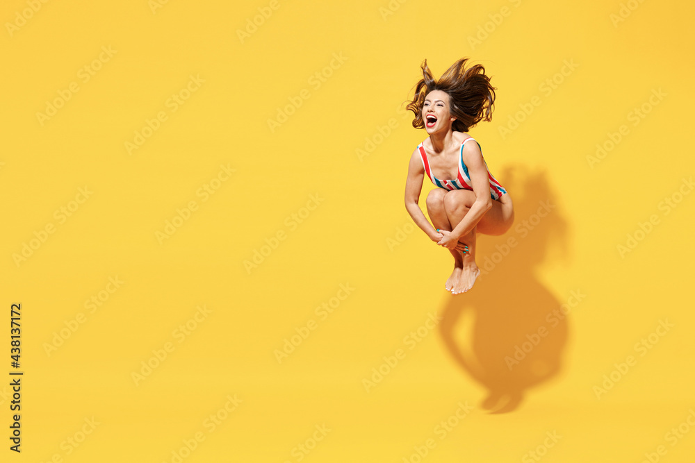 Full length happy young sexy woman slim body wear striped red blue one-piece swimsuit jump dive into water isolated on vivid yellow color background studio. Summer hotel pool sea rest sun tan concept.