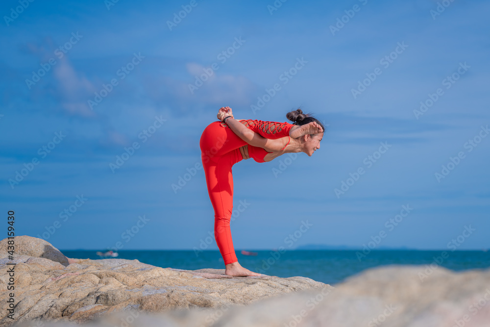 Asian young healthy woman posing practice yoga on stone beach with blue cloud sky and sea background in healthy exercise lifestyle concept.