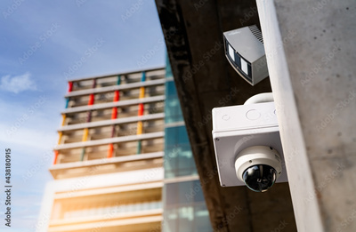 CCTV security camera video system for safety installed outside office building. Closed circuit television . CCTV electronic security system. Police equipment. Video surveillance camera technology.