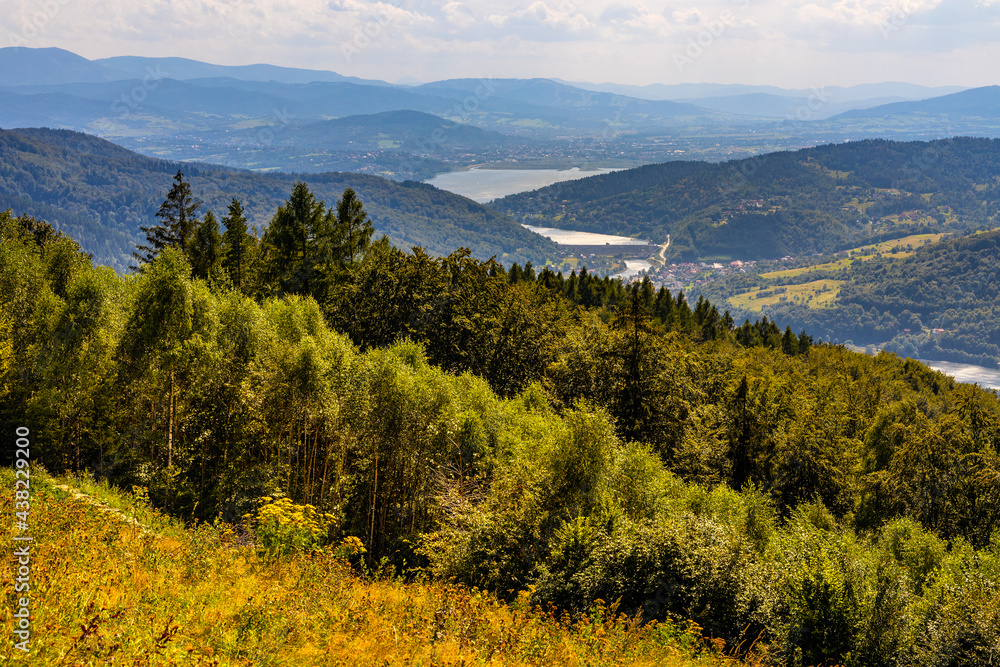 Panoramic view of Beskidy Mountains surrounding Zywieckie and Miedzybrodzkie Lake seen from Gora Zar mountain near Zywiec in Silesia region of Poland