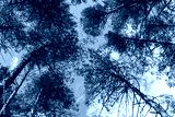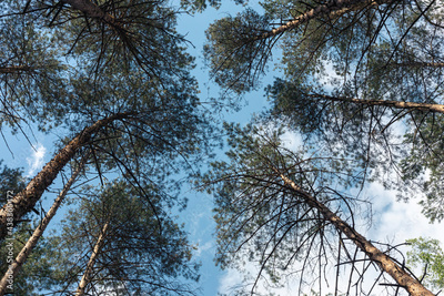 Blue sky through the pine forest trees
