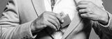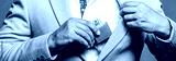 Perfume or cologne bottle and perfumery, cosmetics, scent cologne bottle, male holding cologne. Man perfume, fragrance. Masculine perfume, bearded man in a suit. Male holding up bottle of perfume