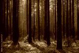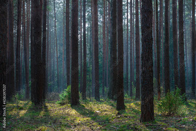 Foggy summer pine forest landscape in the morning