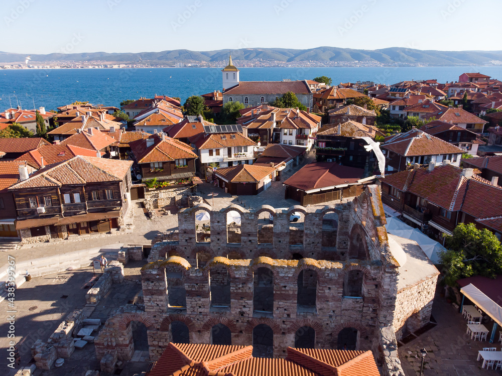 Aerial view of the center of old Nessebar, houses, churches. Drone view from above. Summer holidays destination
