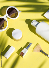 Summer vacation cosmetics flat lay with sunglasses on the yellow background. Top view beauty composition